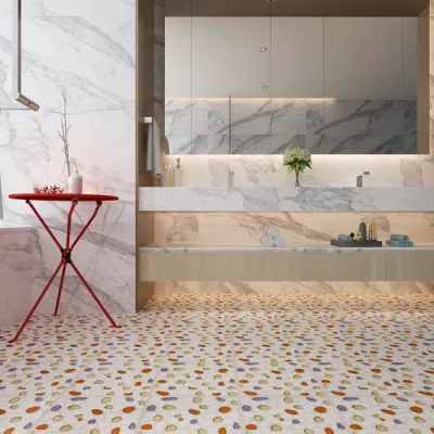 Phòng mẫu gạch trang trí có họa tiết lớn đang dần trở thành mốt trong cộng đồng những người có cá tính mạnh thích những thứ đặc biệt, mang đậm cá tính của người sử dụng. Việc lựa chọn gạch họa tiết lớn cho phòng tắm cũng dần trở nên phổ biến hơn rất nhiều.